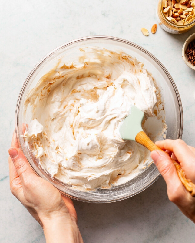 - Whip the Yogurt Base: In a mixing bowl, combine the non-fat Greek yogurt, no-salt-added almond butter, maple syrup, and cinnamon. Whisk with a spatula until the mixture is smooth, uniformly colored, and airy.