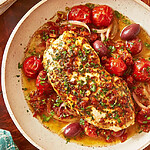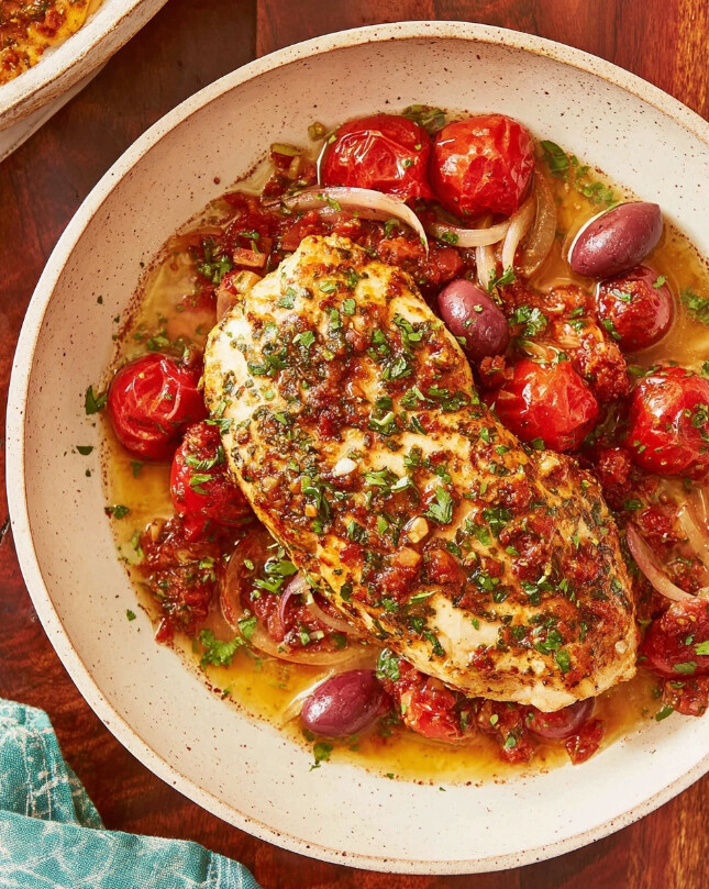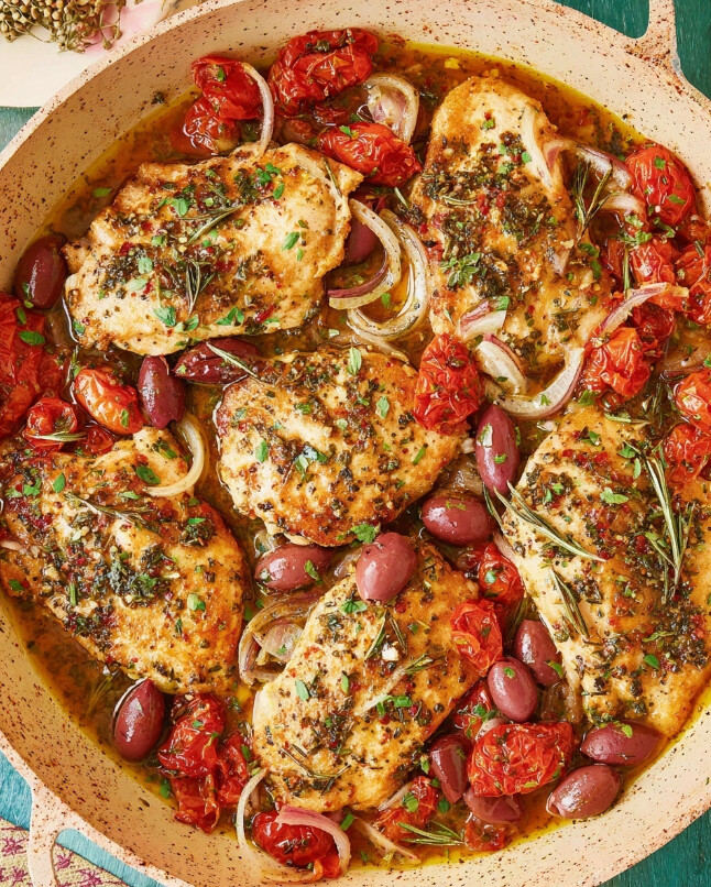 - Garnish and Serve: Remove the skillet from the heat. Garnish generously with fresh parsley. Serve the chicken immediately with a spoonful of the pan sauce, tomatoes, and olives.