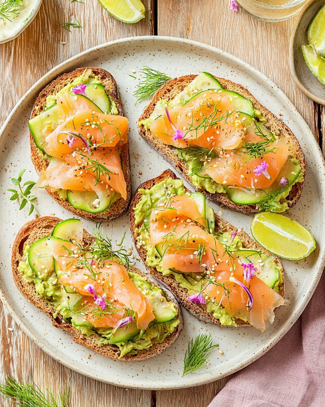 - Assemble Your Masterpiece: Now for the fun part. Spread a generous layer of the smashed avocado and salmon mixture onto each piece of toast. Drape the smoked salmon slices over the top, and artfully arrange your cucumber slices.