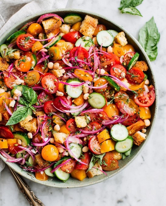 Traditionally, Panzanella can be a bit heavy on refined bread. However, this version is absolutely a healthy Panzanella salad recipe! We use 100% whole-wheat bread for more fiber, add protein-rich cannellini beans, and load it up with fresh veggies. The dressing is also made with heart-healthy extra virgin olive oil.