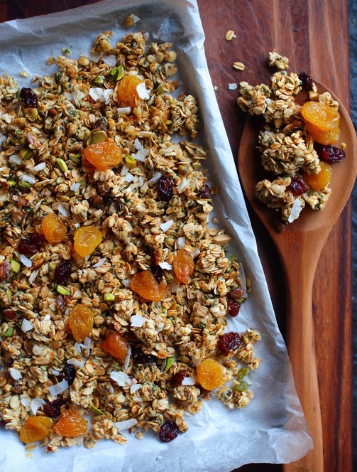 - Remove the baking sheet from the oven and let the granola cool completely on the pan. Once cool, transfer the granola to a large bowl, add the chopped dried cherries and apricots, and toss to combine before storing in an airtight container.